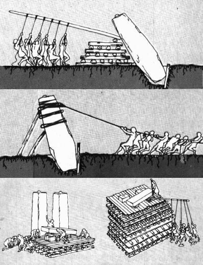 Secuencia del procedimiento para erigir los trilitos de Stonehenge. La segunda fase tuvo lugar hacia el año 2100 aC. se erigieron 80 bloques de arenisca azul en un semicírculo o herradura. Estas piedras provenían de las montañas de Precelly, situadas a 320 km en el sudoeste de Gales. Lo más probable es que las transportaron en balsas a lo largo de la costa galesa, entrando por Bristol a lo largo del río Avon. Luego serían llevadas por vía fluvial y terrestre hasta llegar, sobre rodillos, a la avenida de Stonehenge donde se instalarían conformando dos círculos. Cien años más tarde, los bloques de arenisca azul fueron reordenados para ser sustituidos por piedras silíceas que observamos actualmente (un círculo y un semicírculo). Estas piedras se trajeron desde las colinas de Malborough, a unos 30 km al norte. Algunas de estas últimas piedras llegaban a pesar hasta 26 toneladas, su transporte era hecho a base de rodillos, sogas y palancas. Ya en el sitio de su erección, se cavaba un foso y, poco a poco, el bloque era levantado con un conjunto de palancas, vigas y cuerdas hasta que por el ángulo y su propio peso caía en el foso. A base de cuerdas se ponía en posición vertical. Finalmente se construía gradualmente una plataforma para ir subiendo y colocar el dintel de siete toneladas sobre la cima de dos bloques verticales. Las piedras eran talladas en un ingenioso juego de espigas y cavidades para que columnas y dintel embonaran a la perfección. Los materiales del semicírculo anterior se utilizarían para una segunda herradura en el interior del círculo principal. Se excavan en la parte externa del conjunto una serie de orificios para erigir un doble circulo de piedras azules (círculos de Aubrey), pero ésta construcción nunca se lleva a cabo.