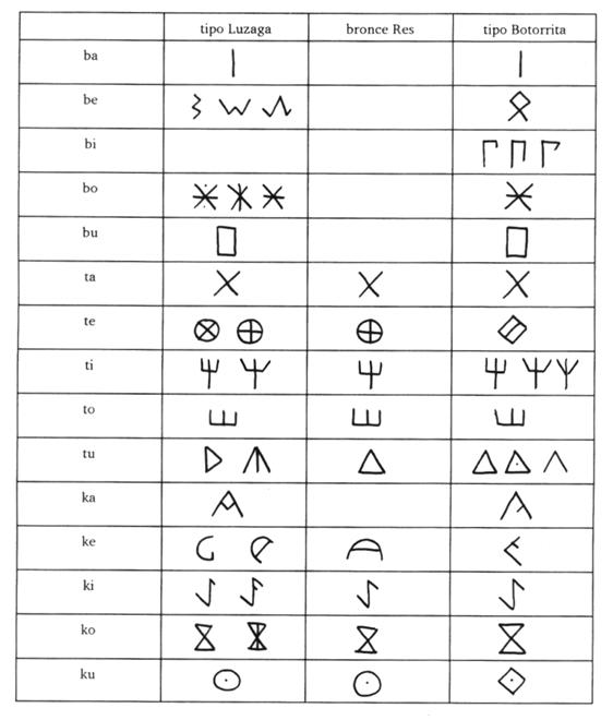 Principales signos de la escritura sudlusitana celtibérica: uso de variantes levemente modificadas de la escritura íbera levantina para escribir lengua celtibérica (una lengua celta indoeuropea). Se usó desde el s. II a.C. principalmente en las cuencas altas de los ríos Ebro y Tajo (desde Palencia a Zaragoza-Teruel).