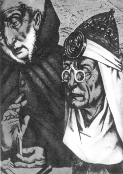 QUEVEDOS. La forma en que el estudioso medieval tiene colocados los lentes se denomina "pince-nez" o quevedos. La fecha de la invención de los anteojos no está clarificada. Los conocimientos medievales abarcaban tanto los descubrimientos de Arquímedes, inventor de los " espejos ustorios ", lentes potentes mediante los cuales había incendiado las naves romanas que sitiaban Siracusa, como las teorías de Euclides, expuestas en sus textos "Optica" y "Catróptica". Pero saliendo del marco antiguo de las teorías, en pleno siglo XIII, el sabio inglés Roger Bacon declara: "Esta ciencia es indispensable para el estudio de la teología y del mundo... Es la ciencia de la visión y un ciego, se sabe, no puede conocer nada de este mundo." La óptica será la base; de la nueva actitud filosófica ante el conocimiento: la que descuenta las creencias tradicionales para oponerles la experiencia del observador, quien solo afirma lo que "ha visto por sus propios ojos". Y lo que puede ver el ojo humano constituye un campo que se ampliará gracias a ]os nuevos instrumentos ópticos: el lente, en primer término, llamado así por su forma, que recuerda una lenteja. Ese lente que, colocado en una armadura apropiada, comenzará por corregir los defectos de la visión, gracias a los anteojos... ¿Cuándo se inventaron los anteojos? La fecha exacta no ha sido determinada, pero existe un antecedente concreto en el texto de un sermón pronunciado por el fraile dominicano Giordano de Pisa, en 1306: " Aún no han pasado veinte años desde que se encontró la manera de fabricar lentes de vidrio que permiten una buena visión de las cosas... " Otras referencias, correspondientes también a las primeras dos décadas del silo XIV, permiten establecer que se trataba de lentes biconvexos para corregir la presbicia, enfermedad mucho más frecuente que la miopía. El lente cóncavo para miopes sólo aparece cien años más tarde. La armadura se colocaba a horcajadas sobre la nariz, al estilo "pince-nez" o quevedos; pero ya en el siglo XVI aparecen las armaduras de tipo moderno, que no han cambiado desde entonces.